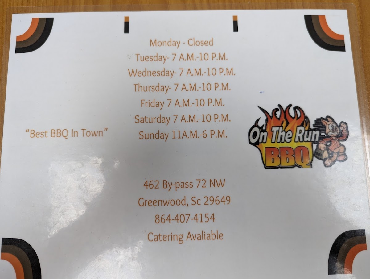 Welcome to On The Run BBQ, located in the heart of South Carolina, where flavorful dishes cater to all your cravings any time of day. Their menu captivates with a variety of starters like Pulled Pork Sliders and savory Nachos, perfect for sharing. If you're in the mood for burgers, indulge in options ranging from classic Cheeseburgers to the hearty DBL Hamburger, ensuring satisfaction with every bite.